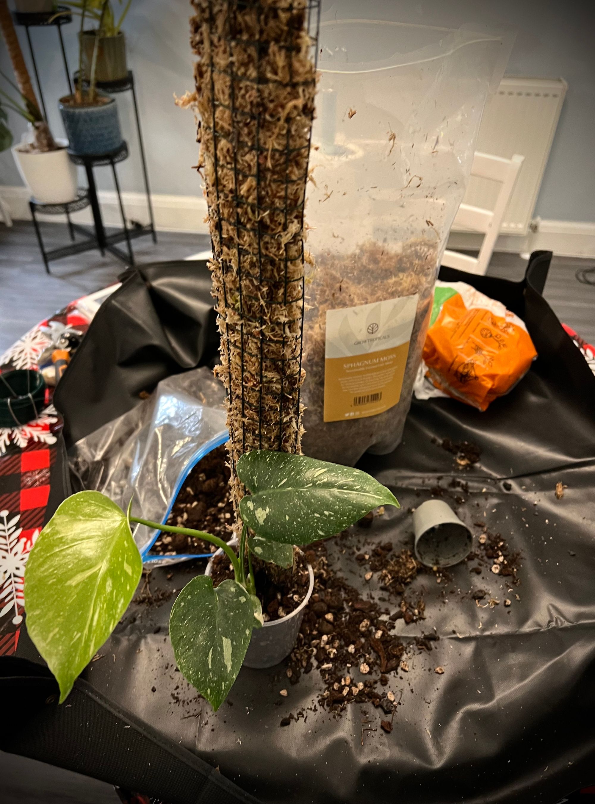 - Once you have finished wrapping the moss around the pole, give it a good misting with water to keep it hydrated. If you are using preserved moss, you can skip this step.