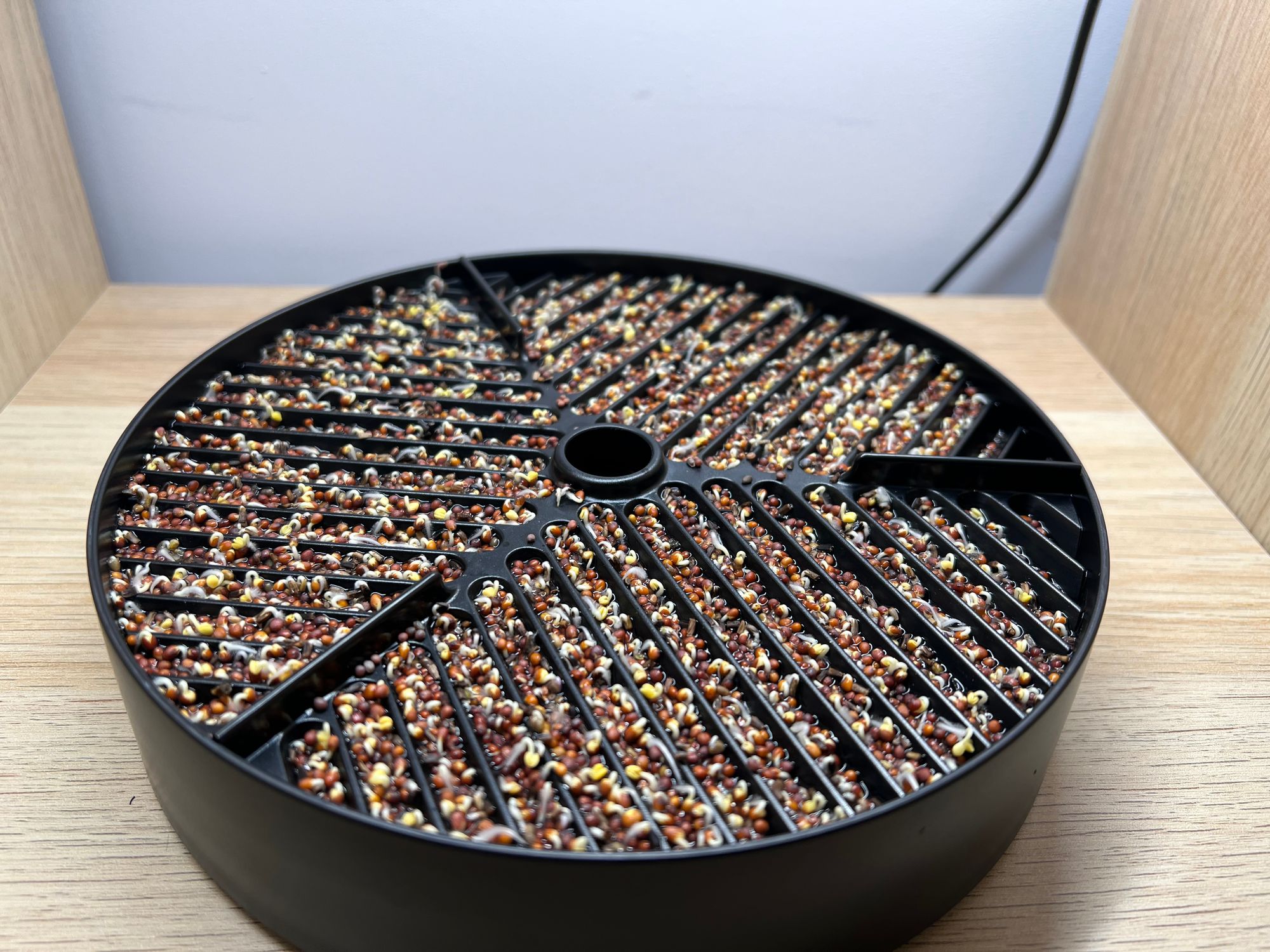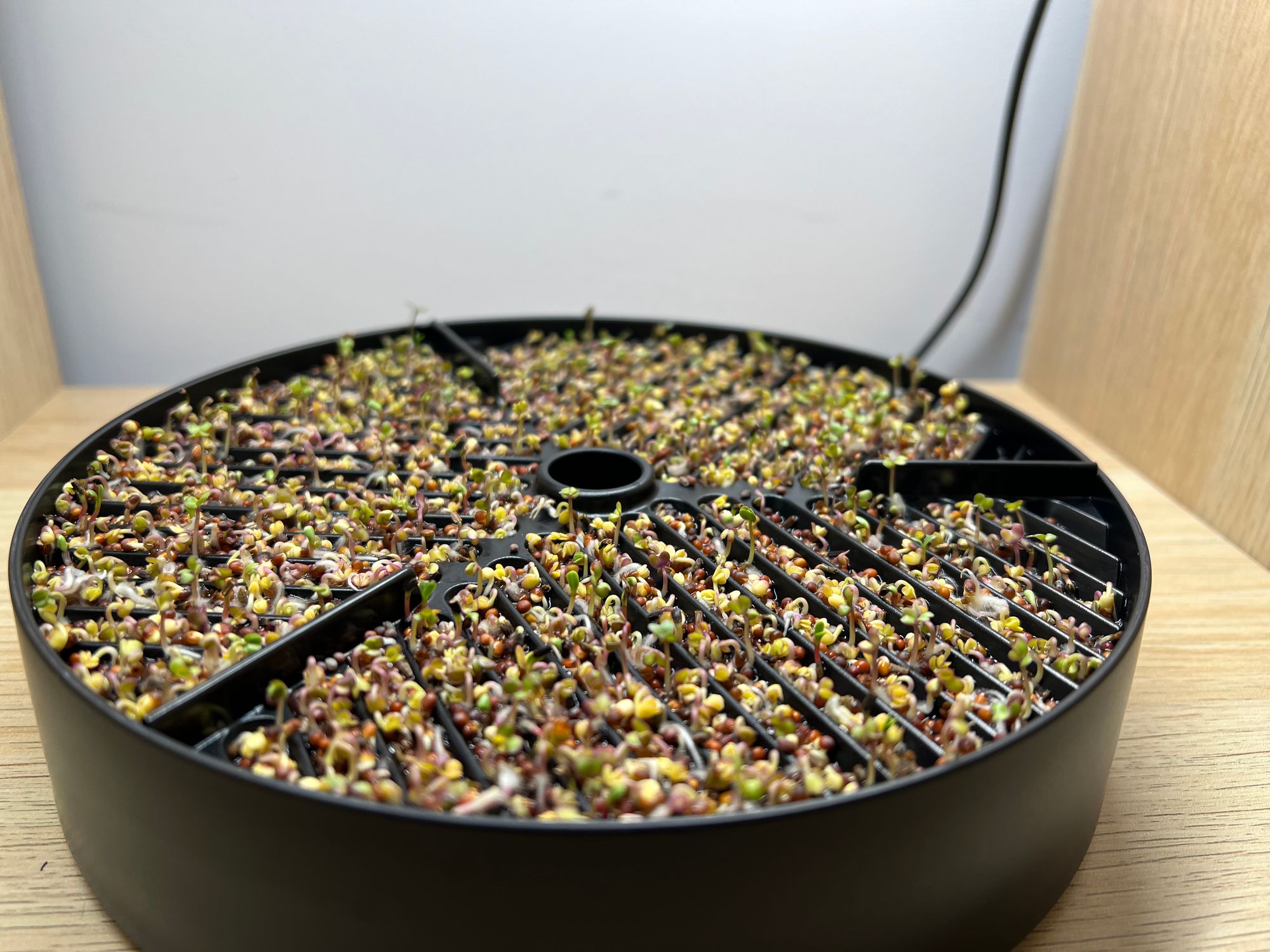 After a few days, the seeds will begin to germinate and grow (see image above). At this point, the lid can be removed and the micropods can be placed under grow lights to provide the plants with the necessary light for photosynthesis (see image below). The nutrient solution is constantly cycled through the system, providing the plants with the necessary nutrients to grow.