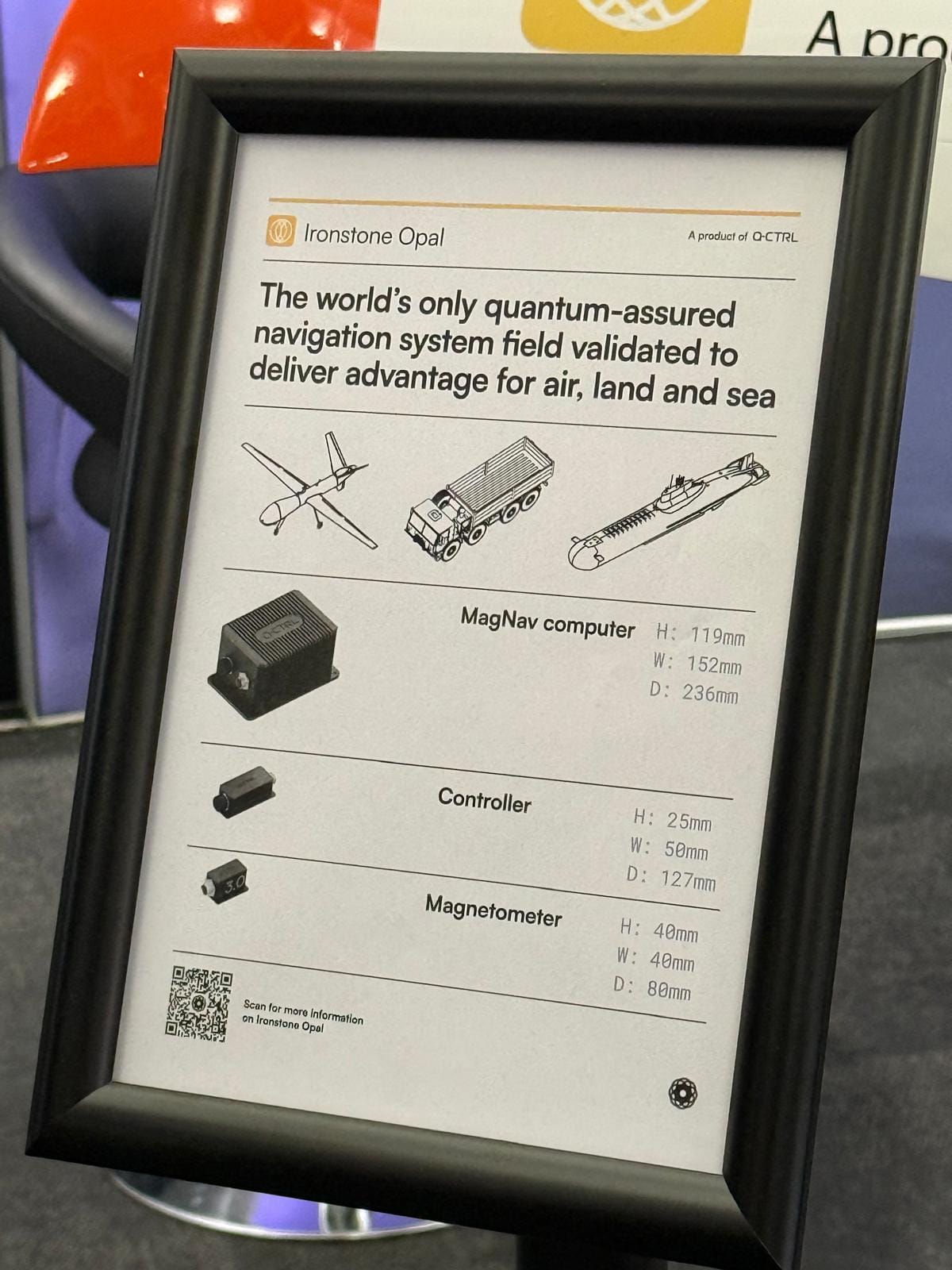 At the Q‑CTRL booth, their Ironstone Opal MagNAV pitch was ront‑and‑centre. One poster (photo below) bills it as “the world’s only quantum‑assured navigation system… for air, land and sea” and even lists the MagNAV computer dimensions: H 119 mm × W 152 mm × D 236 mm. That’s the sort of footprint an integrator can actually plan around. Q‑CTRL has also been public about Ironstone Opal’s aim—navigation resilience when GPS is degraded or attacked.