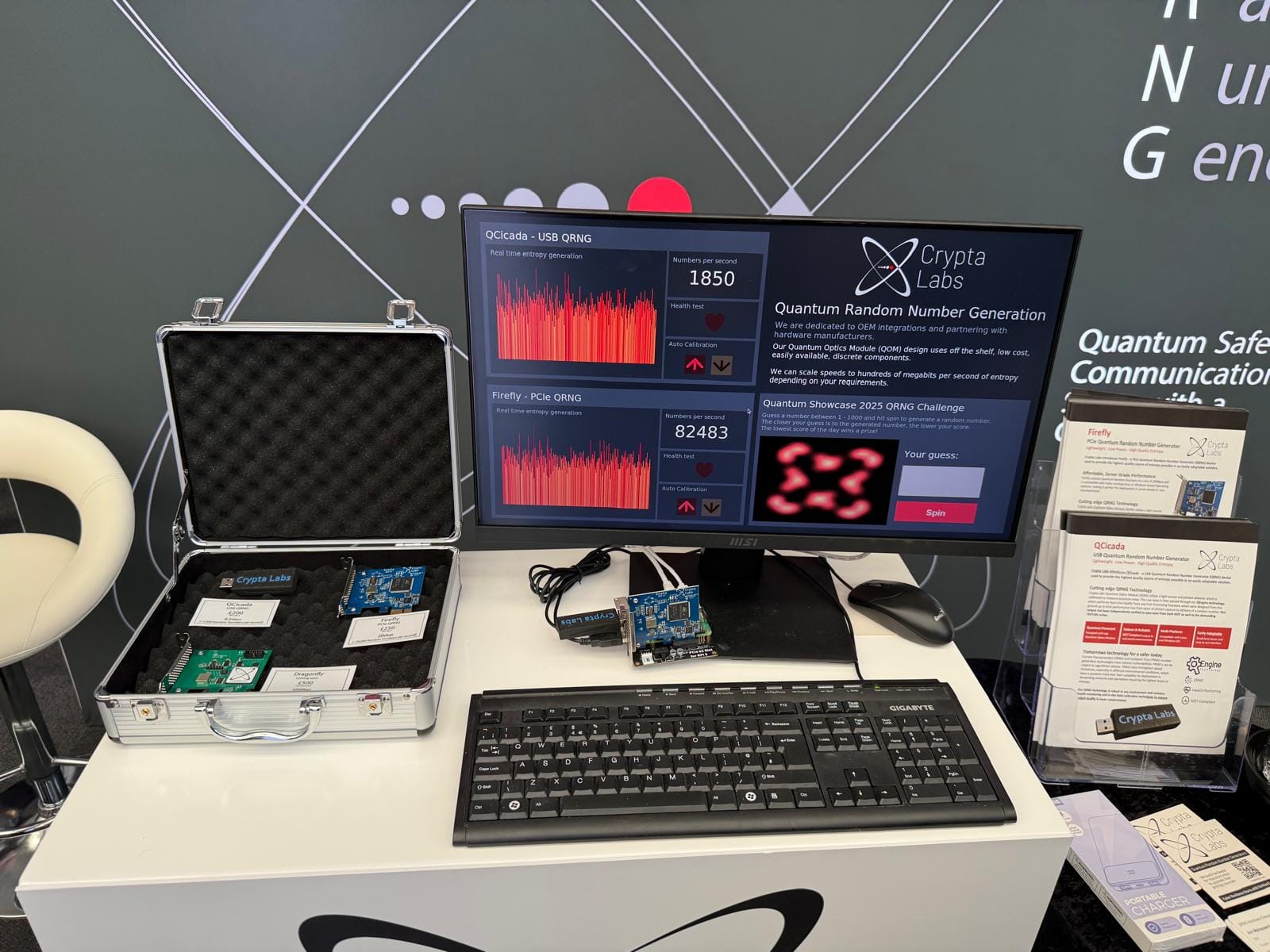 - Crypta Labs demoed two QRNGs—the QCicada (USB) and Firefly (PCIe)—plus a fun “QRNG challenge” at their stand.